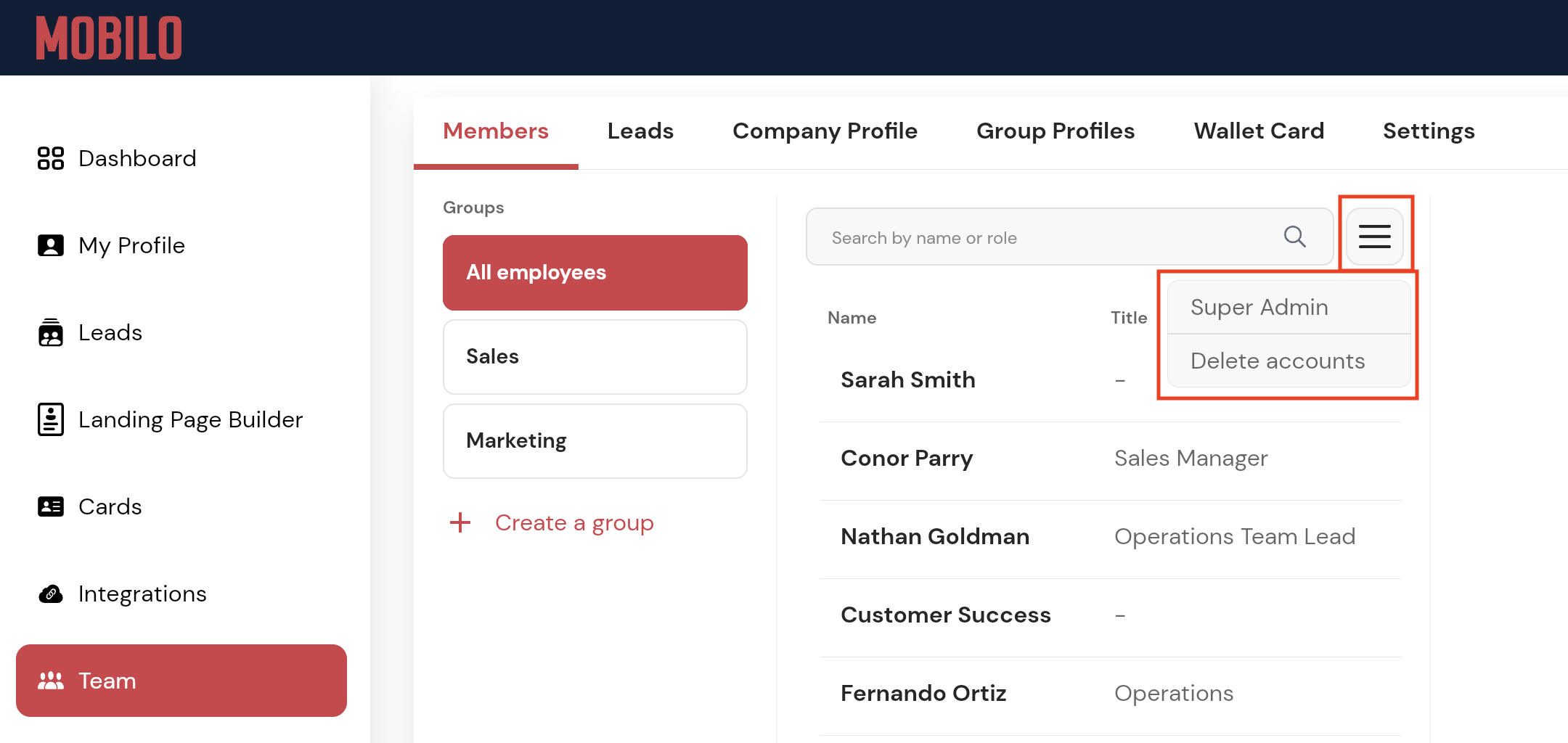 Managing big teams may require more than one person. That's why in Mobilo you'll be able to give any of your team members an admin access to give you a hand. If the people that need admin access don't have a card or a Mobilo account reach out to support@mobilocard.com so we can assist.